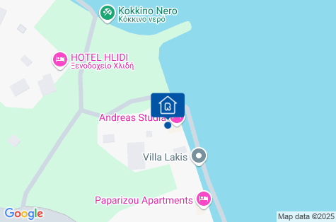 Obydlí se nachází pouhých 30 m od oblázkové a kamenité pláže. V blízkosti Kokkino Nero se nacházejí také další velmi pěkné, písečné a dobře rozvinuté pláže Koutsoupia a Plati Amos (lehátka a slunečníky zdarma po objednání v plážovém baru).