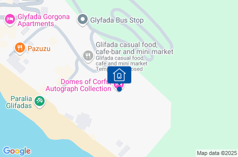 Hotel se nachází na západním pobřeží Korfu, v malé vesnici Glyfada. V okolí se nachází několik taveren. Na letiště cca 16 km.