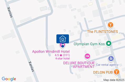Nachází se vedle hotelu Apollon, s nímž tvoří jeden komplex (vzdálenost cca 150 m, přechod po cestě bez nutnosti přecházet ulici). Nachází se v malebné zahradě ve vesničce Lambi s mnoha obchody, bary a tavernami a jen cca 1,5 km od přístavu hlavního města ostrova (autobusová zastávka 10 m od hotelu Apollon). Vzdálenost od letiště je přibližně 25 km.