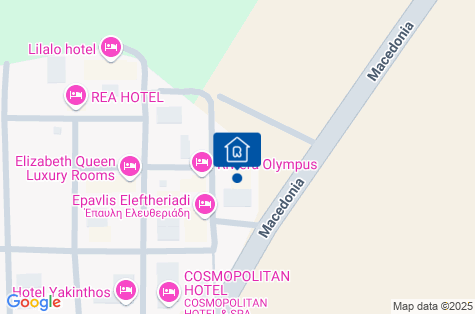 Hotel se nachází asi 800 m od centra Paralie, kde jsou obchody, bary, restaurace, diskotéky atd. (přístup do centra prvních 400 m po běžné silnici, poté začíná hlavní pěší ulice Paralie, která vede dalších 400 m až do jejího samotného centra). Transfer z letiště do objektu trvá přibližně 80 min. Přibližně 800 m od aparthotelu, v centru Paralie, se nachází zastávka autobusu veřejné dopravy, odkud se můžete dostat do dalších měst Olympské riviéry. Nejbližší obchod se nachází přibližně 250 m od hotelu.
