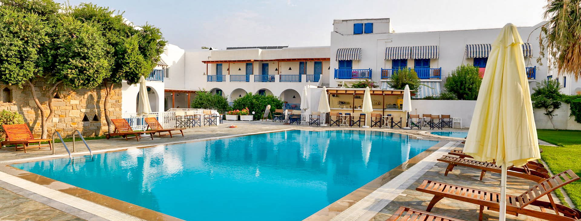 Recepce otevřená 24 hodin denně (v hlavní sezóně), recepční, snídaňová místnost, venkovní bazén se sladkou vodou, lehátka a slunečníky u bazénu, bar u bazénu, bezplatné parkoviště, zahrada, terasa, veřejná TV místnost. Hotel dále nabízí služby žehlení, praní prádla, pronájem aut/motocyklů, hlídání dětí, transfery do/z přístavu - vše za příplatek.