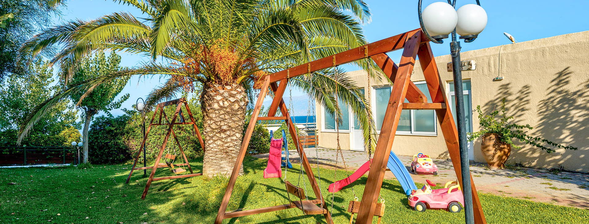 24hodinová recepce s prostornou vstupní halou, terasa s výhledem na moře, zahrada, venkovní bazén pro dospělé a dětský bazén (lehátka a slunečníky zdarma), dětské hřiště, posilovna, minimarket, obchod se suvenýry a tabákem, prádelna a žehlení prádla (za poplatek), plážový bar, bar u bazénu, hlavní restaurace.