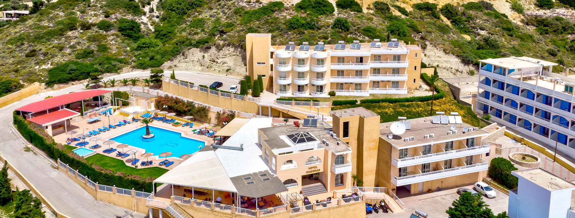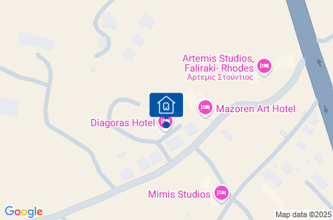 Hotel Diagoras se nachází ve skvělé lokalitě s krásným výhledem na celé město (cca 1,5 km od centra) a pláž Faliraki. Na autobusovou zastávku, odkud lze dojet na mnoho míst na ostrově, je cca 3 minuty procházkou. Aquapark ve Faliraki je vzdálen cca 5,5 km a letiště cca 15 km od hotelu Diagoras.