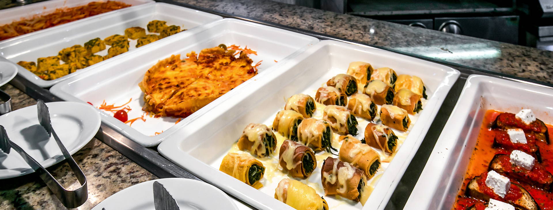 All inclusive: snídaně formou bufetu (7:00-10:00), kontinentální snídaně (10:00-10:30), oběd (12:30-14:30) a večeře (18:30-21:30). Kromě toho občerstvení mezi hlavními jídly během dne - pizza, saláty (10:00-22:00 ). V určených barech se podávají místní nealkoholické a alkoholické nápoje (10:00-23:00). Kromě toho je k dispozici italská restaurace (12:00-23:00), řecká taverna - nutná rezervace předem (19:00-22:00) a Burger House v budově Garden (18:30-21:30).