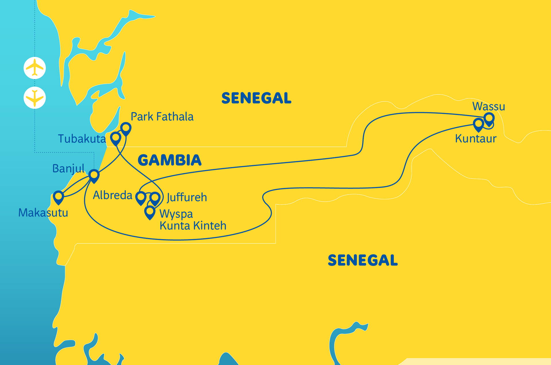 Pevninové a vodní safari podél řeky Gambie a řeky Saloum - mangrovníky, galerijní lesy, lvi, žirafy, zebry, opice, ráj ptáků • stopy kolonialismu a historie otroctví - vesnice Kunta Kinteh - Juffureh • mystický africký animismus a fetišismus • rajské pláže Atlantiku v Cap Skirring