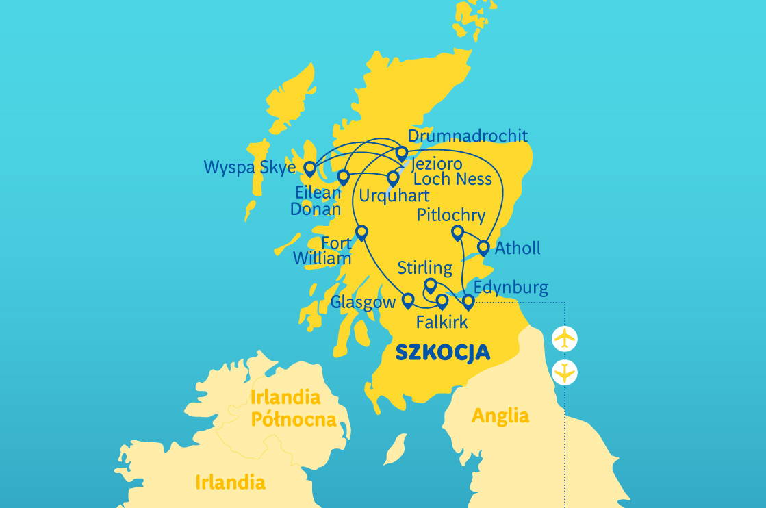 Glasgow – největší metropole na severu ostrova • Edinburgh – hlavní město království se slavným hradem na skále • Oblast Pitlochry – země vynikající whisky • Nessie – lochnesská příšera, která proslavila Skotsko, a plavba po jezeře • Ostrov Skye a hrad Eilean Donan – nejmalebnější hrad v království • Glencoe neboli „Údolí slz“ – filmové kulisy a krvavá historie • Glenfinnan a slavný viadukt
