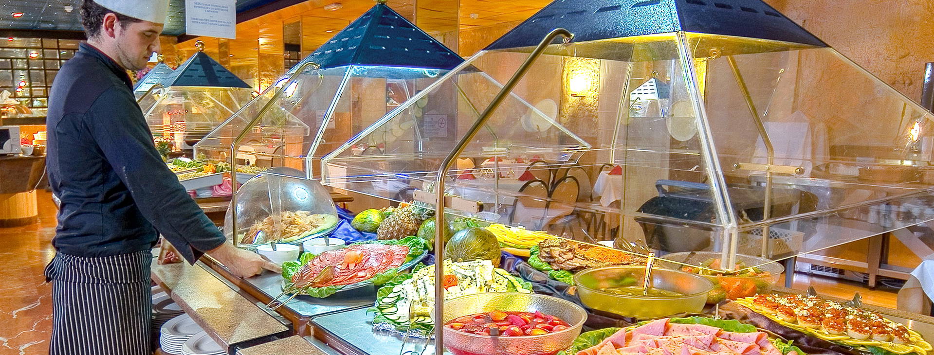 - 3 jídla: oběd (13:00 - 15:30) a večeře (20:00 - 22:30) formou bufetu v hlavní restauraci, nápoje k jídlům za příplatek,