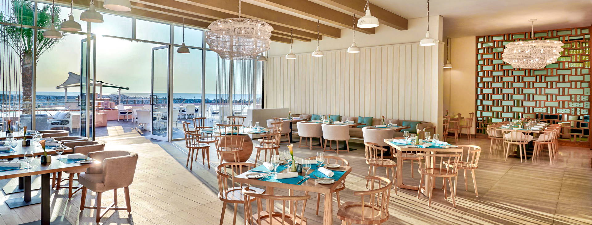 Prostorná vstupní hala s vytříbeným interiérem, recepcí otevřenou 24 hodin denně a výtahy. Hosté hotelu mohou využít hlavní bufetovou restauraci (mezinárodní kuchyně) a čtyři restaurace a la carte s různými specialitami, včetně mořských plodů (za příplatek, nutná předchozí rezervace), a příjemný bar u bazénu a snack bar. Součástí hotelu je zajímavě řešený venkovní bazén. Lehátka, slunečníky a osušky k bazénu jsou k dispozici zdarma.