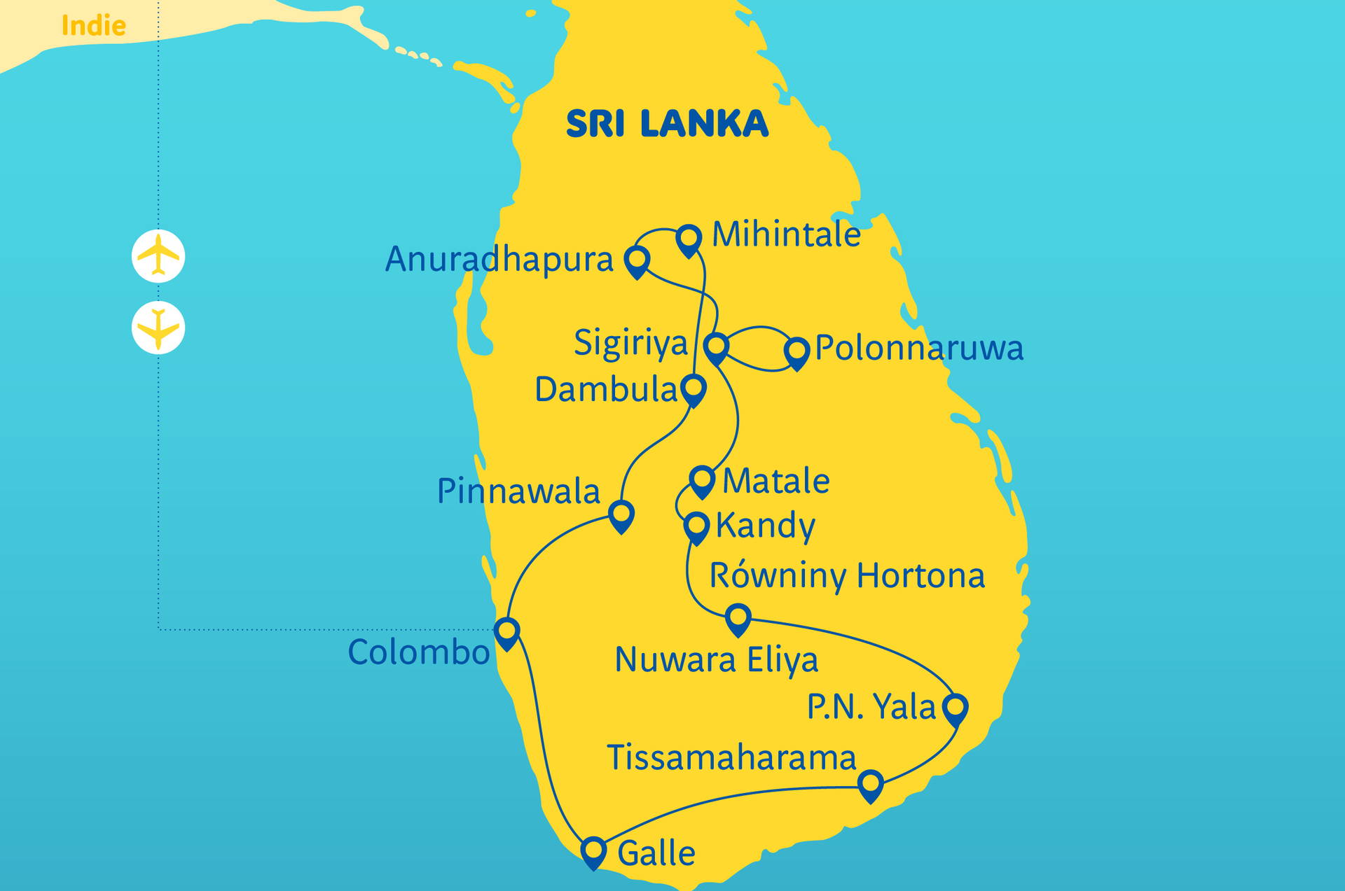 Buddhistická centra uctívání - Anuradhapura a Mihintale • sloní sirotčinec • Chrám Buddhova zubu v Kandy • jeskynní malby v Sigiriyi a Dambulle • čajové plantáže • Hortonova rovina a „konec světa“