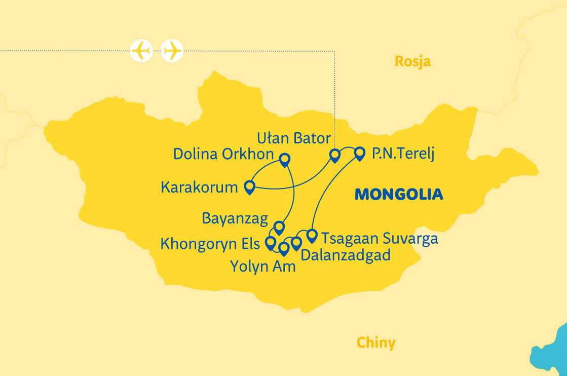 Tajemství Mongolska: Po stopách říše Čingischána • Ulánbátar – hlavní město Mongolska • Národní park Gorkhi-Terelj • impozantní útes Tsagaan Suvarga • údolí Yolyn Am vytesané starodávnými řekami • duny Khongoryn Els • Bayanzag – hořící útes • Klášter Ongiin • Údolí Orkhon • Karakorum – bývalé hlavní město Mongolska