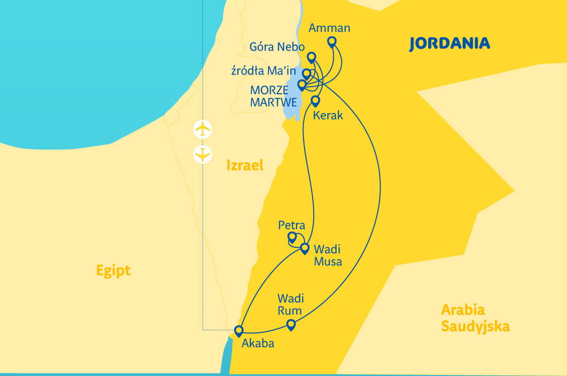 Po snídani transfer na letiště v Akabě. Odlet do Polska. Pro ubytované klienty - transfer do vybraného hotelu v Akabě nebo u Mrtvého moře a pobyt od 8. do 14. dne a 15. den odhlášení a odlet do Polska. (Trasa cca 50 km).