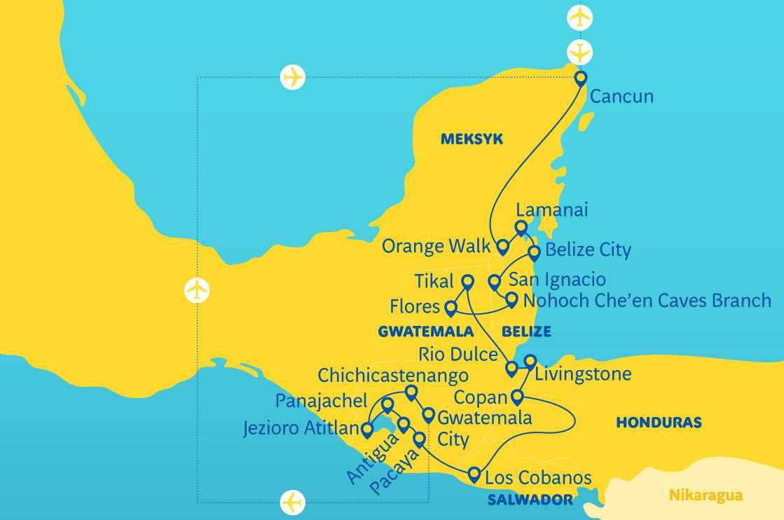 Mexiko, Belize (Lamanai), Guatemala (Tikal) a Honduras (Copán) • karibská volnost • Indiáni Garífuna a ráj na zemi - Caye Caulker • koloniální dědictví v Antigue • Salvador - nejmenší země v pacifickém Ohnivém kruhu • pobyt v Cancúnu a Salvadoru (All Inclusive)