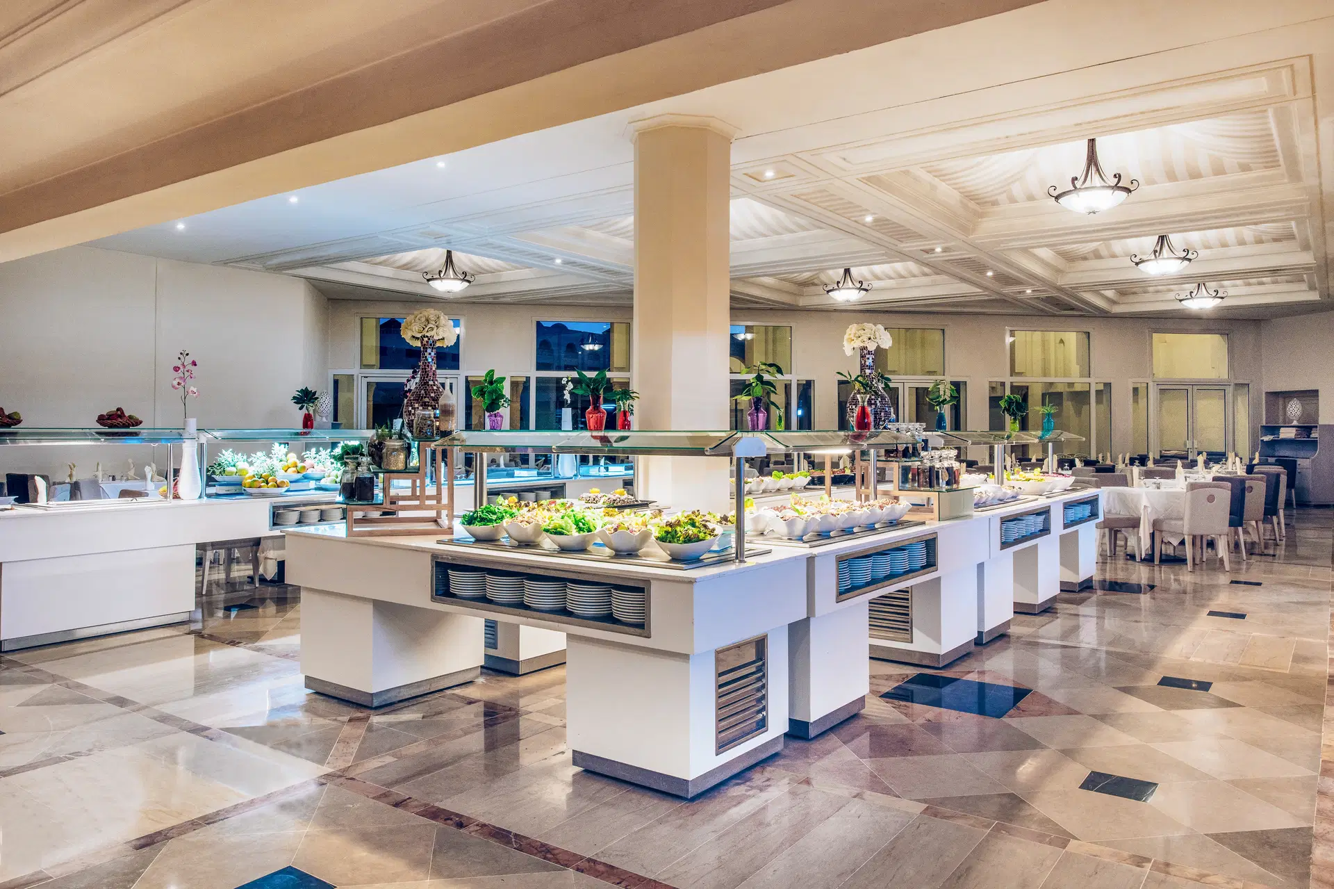 All inclusive zahrnuje snídaně (6:30-10:00), obědy (12:30-14:00) a večeře (18:30-21:30) formou bohatého bufetu podávaného v hlavní restauraci. Občerstvení zahrnuje sendviče, zmrzlinu, ovoce, saláty, pizzu (14:30-17:00) a tzv. pozdní bufet: káva, čaj, ovoce, saláty (22:00-24:00). Nealkoholické nápoje a místní alkoholické nápoje během jídla jsou zahrnuty v ceně a jsou k dispozici také v lobby baru (10:00-24:00) a u bazénu (10:00-18:00). 1x za pobyt možnost využít restauraci a'la carte (italskou nebo tuniskou; nutná předchozí rezervace).