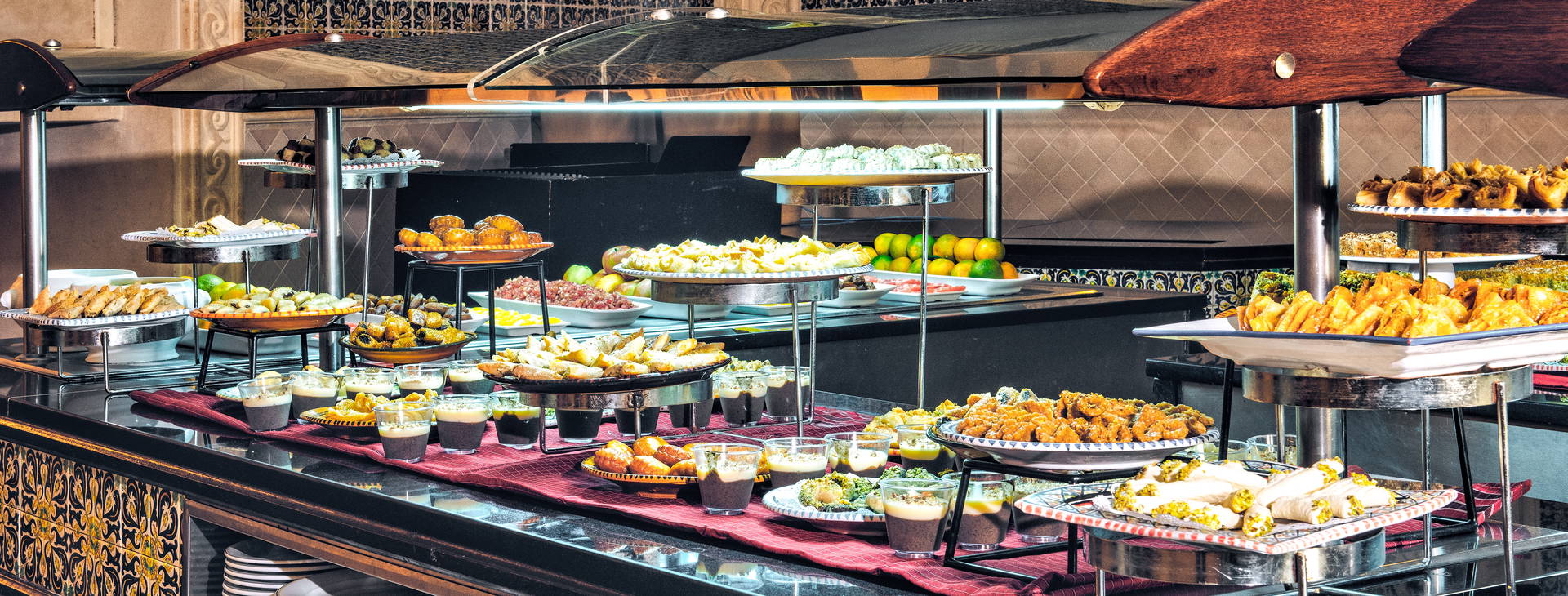 All Inclusive: snídaně (7:00-10:00), obědy (12:30-14:30) a večeře (18:30-21:30) podávané v hlavní restauraci formou bufetu (mezinárodní a regionální kuchyně). Kromě toho mohou klienti využít lobby bar (10:00-24:00): alkoholické a nealkoholické nápoje; bar u bazénu (10:00-18:00): občerstvení a nápoje; Barbeque bar podávající občerstvení (12:30-17:00) a maurskou kavárnu (16:00-23:00): tradiční čaj a káva. Možnost využít 1x za pobyt jednu ze 2 tematických restaurací a la carte (tuniská nebo italská; nutná předchozí rezervace).