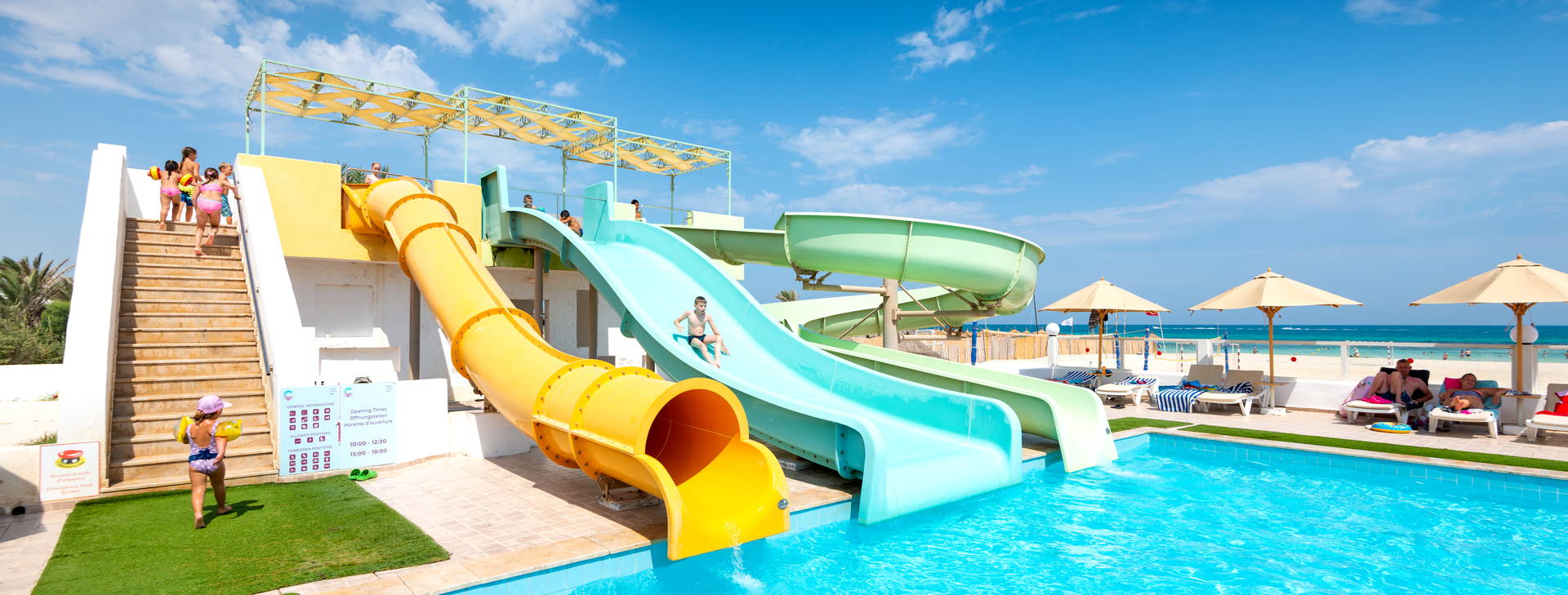 Některé atrakce a zařízení (zejména bazény a aquaparky a pláže/plážové bary) mohou být k dispozici pouze během hlavní sezóny (15/06-15/09).