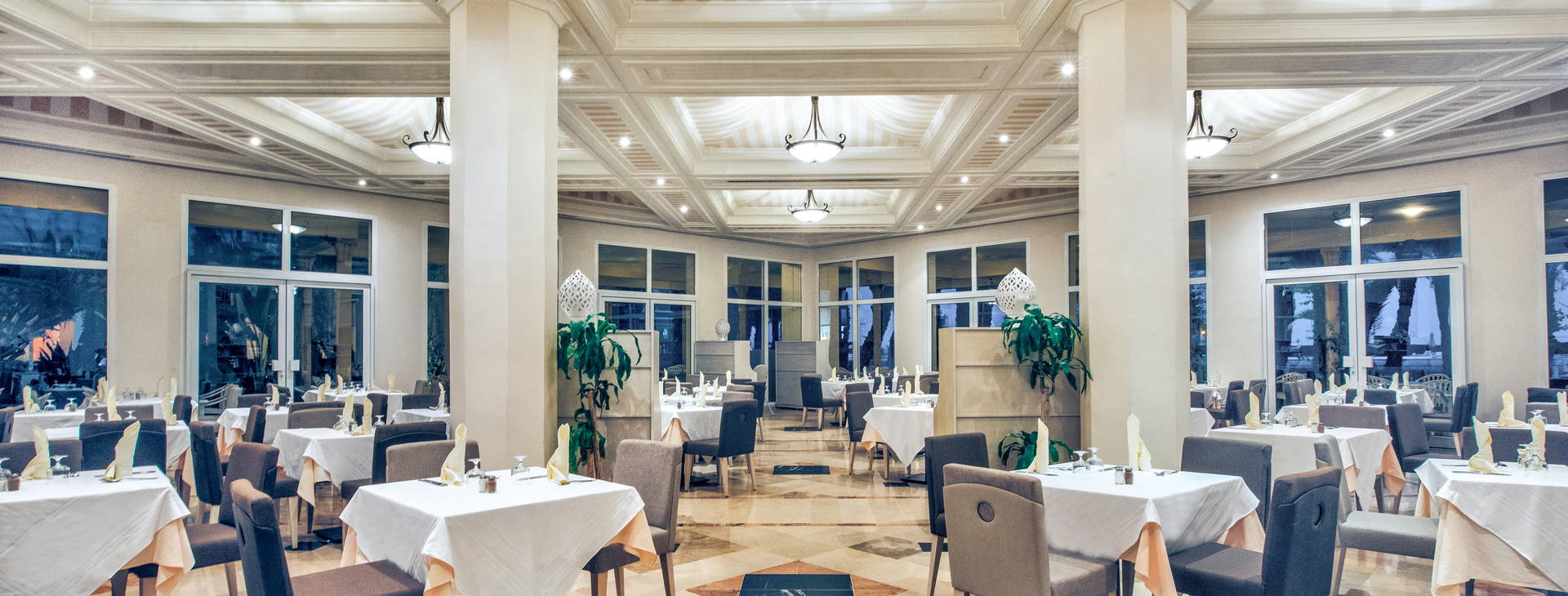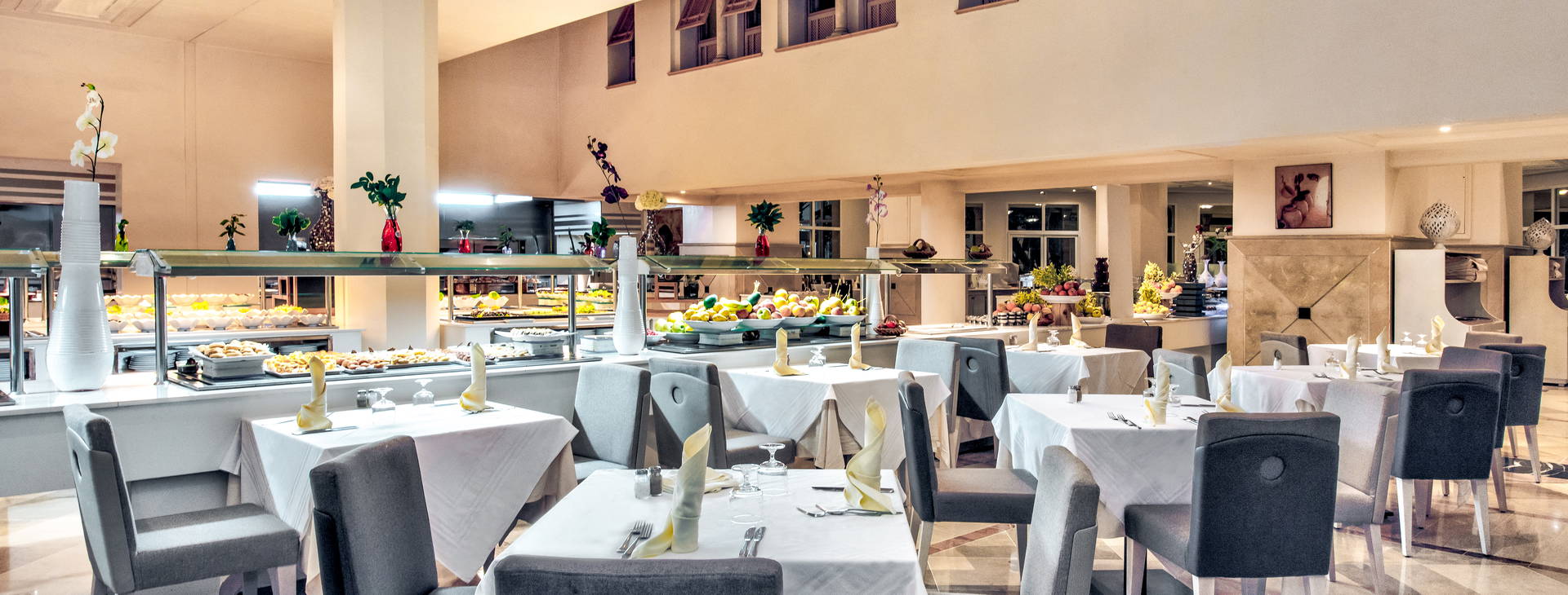 All inclusive zahrnuje snídaně (6:30-10:00), obědy (12:30-14:00) a večeře (18:30-21:30) formou bohatého bufetu podávaného v hlavní restauraci. Občerstvení zahrnuje sendviče, zmrzlinu, ovoce, saláty, pizzu (14:30-17:00) a tzv. pozdní bufet: káva, čaj, ovoce, saláty (22:00-24:00). Nealkoholické nápoje a místní alkoholické nápoje během jídla jsou zahrnuty v ceně a jsou k dispozici také v lobby baru (10:00-24:00) a u bazénu (10:00-18:00). 1x za pobyt možnost využít restauraci a'la carte (italskou nebo tuniskou; nutná předchozí rezervace).