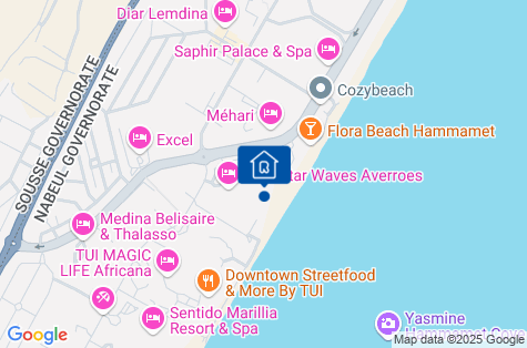 Hotel se nachází v klidné, půvabné turistické oblasti Hammamet-Yasmine, asi 12 km od historického centra města Hammamet a asi 35 km od letiště Enfidhi. V pěší vzdálenosti se nacházejí bary, restaurace, obchody se suvenýry a malebný jachetní přístav. V blízkosti hotelu se nachází zábavní park s malým aquaparkem. Vesnice je známá svými krásnými písečnými plážemi. UPOZORNĚNÍ! Cena zájezdu nezahrnuje místní pobytovou taxu ve výši 12 TND/osoba/den. Maximální výše pobytové taxy se vypočítává na 15 po sobě jdoucích nocí, a to i v případě delšího pobytu. Osoby mladší 12 let jsou osvobozeny od placení pobytové taxy. Taxa je povinná a platí se přímo na recepci před ubytováním klientů v hotelu.