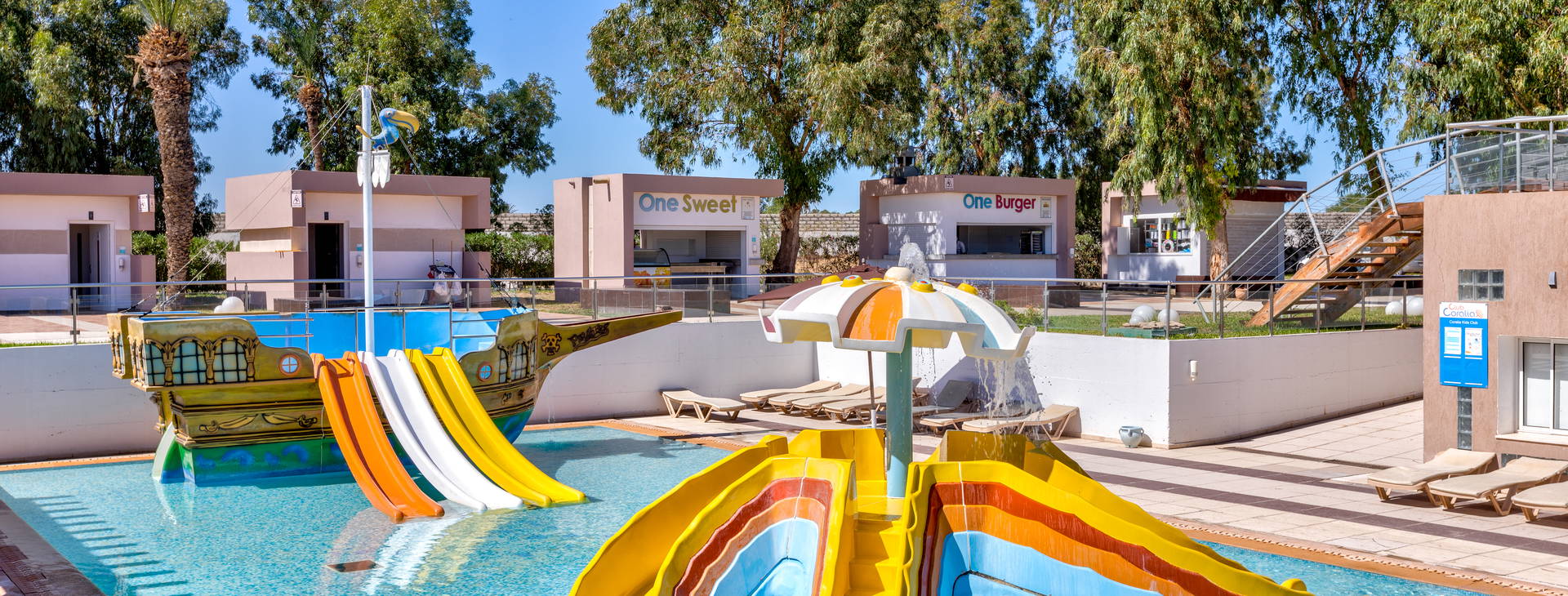 Recepce, vstupní hala s bezplatným Wi-Fi, směnárna, 3 venkovní bazény (1 pro osoby starší 16 let), vnitřní bazén, dětský bazén se 4 skluzavkami (lehátka a slunečníky u bazénu zdarma, plážové osušky na kauci), aquapark s 9 různými skluzavkami, hlavní restaurace, 4 restaurace a la carte, 3 restaurace s občerstvením, bary: Lobby, diskotéka, u bazénu, u Aquaparku, na pláži, tenisový kurt (výuka a osvětlení za poplatek), stolní tenis, víceúčelové hřiště, lázeňské centrum (procedury za poplatek), 3 minikluby pro děti různého věku (od 3 do 17 let). Za příplatek: půjčovna aut, obchody, prádelna, kadeřnictví.
