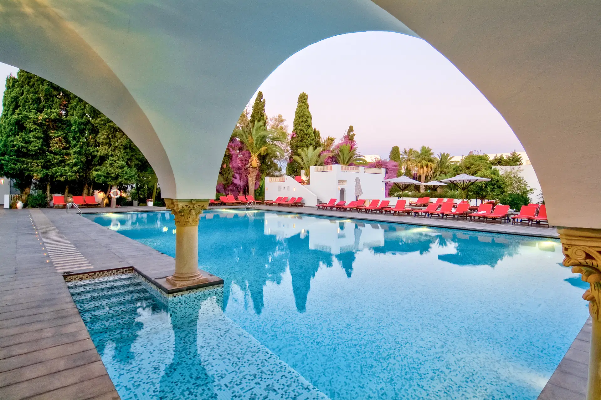 Venkovní bazén (nevyhřívaný) s oddělenými dětskými bazény a vnitřní bazén (v zimě vyhřívaný), lehátka a slunečníky (zdarma), lobby bar (otevřený do půlnoci), bar Jasmin otevřený 24 hodin (výběr alkoholických a nealkoholických nápojů (místní vína, piva, likéry, džusy, limonády, káva a koktejly) v rámci služby "all inclusive" po dobu 24 hodin), bar na pláži (8:00-22:00):Služby za poplatek: trezor, hlídání dětí na vyžádání, směnárna, půjčovna aut, bar Semiramis (8:00-24:00), 3 restaurace A La Carte (u pláže) na večeře: italská, tuniská a asijská (nutná předchozí rezervace), místní alkoholické nápoje na diskotéce do 02:00, maurská kavárna (za poplatek, vodní dýmka zdarma), golfový transfer zdarma.