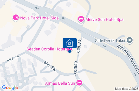 Seaden Corolla Hotel se nachází cca 4 km od města Side a cca 7 km od Manavgatu. Letiště v Antalyi je vzdáleno cca 65 km od hotelu.