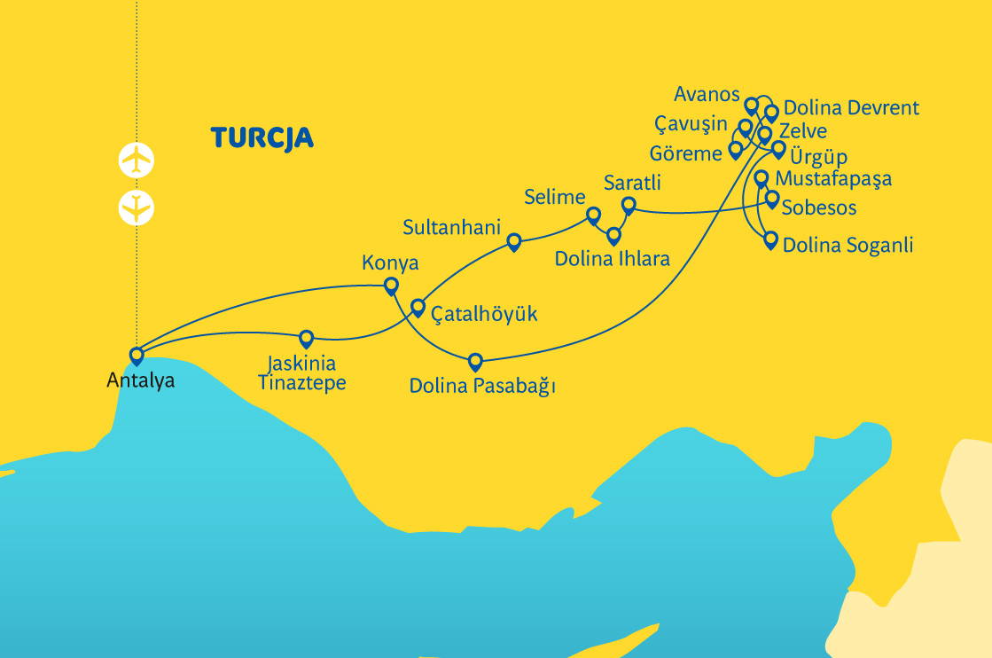 Jeskyně Tinaztepe Cavern - podzemní zázrak, fascinující Kappadokie, trekking v údolí Ihlara, pevnost Uchisar, bláznivá expedice na čtyřkolkách, rafting na řece Kizilirmak, Zelve - skalní kostely, Pasabag - procházka mezi „kapadockými houbami“, offroad v měsíčním údolí, pro zájemce: projížďka na koni, pro zájemce další týden pobytu na Turecké riviéře