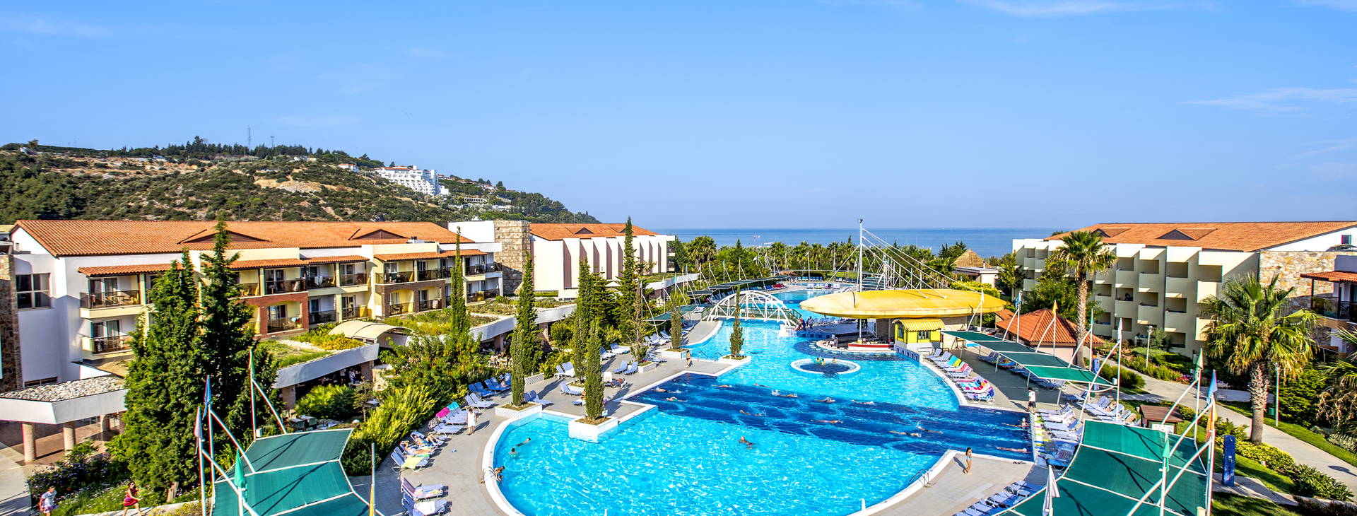 Rozlehlý resort bohatý na zábavu se nachází asi 9 km od centra Kusadasi, 9 km od města Selcuk a 135 km od letiště Bodrum. Rozkládá se na mimořádně velké ploše a nabízí zábavu pro rodiny s dětmi, páry i mladé lidi. Skládá se ze dvou částí World Hotel a Club Hotel. Nachází se přímo na krásné široké písečné pláži s pozvolným sestupem do moře (lehátka a slunečníky zdarma), avšak vzhledem k velké rozloze a rozdílnému umístění pokojů se vzdálenost od pláže může lišit.