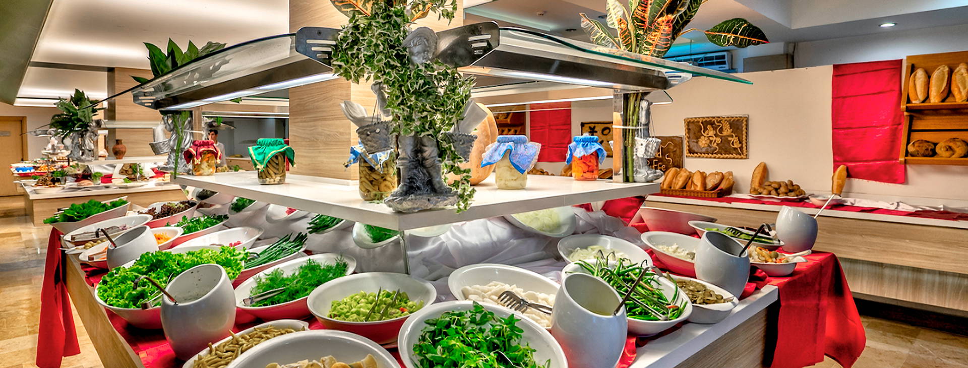 Ultra All Inclusive: snídaně (07:00-10:00), pozdní snídaně (10:00-11:00), oběd (12:45-14:00), večeře (19:30-21:30) podávané formou bufetu. Občerstvení během dne (12:00-16:00), odpolední čaj (17:00-18:00), zmrzlina (14:30-17:00), přestávka na kávu (16:00-17:00), noční občerstvení (23:30-02:00). Místní nealkoholické nápoje k dispozici 24 h a místní alkoholické nápoje a některé dovážené alkoholické nápoje k dispozici do 02:00 h v lobby baru. Ostatní dovážené nealkoholické a alkoholické nápoje za příplatek.