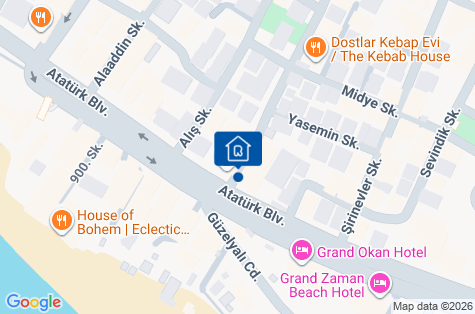 • Hotel se nachází v Alanyi v blízkosti mnoha obchodů a restaurací.