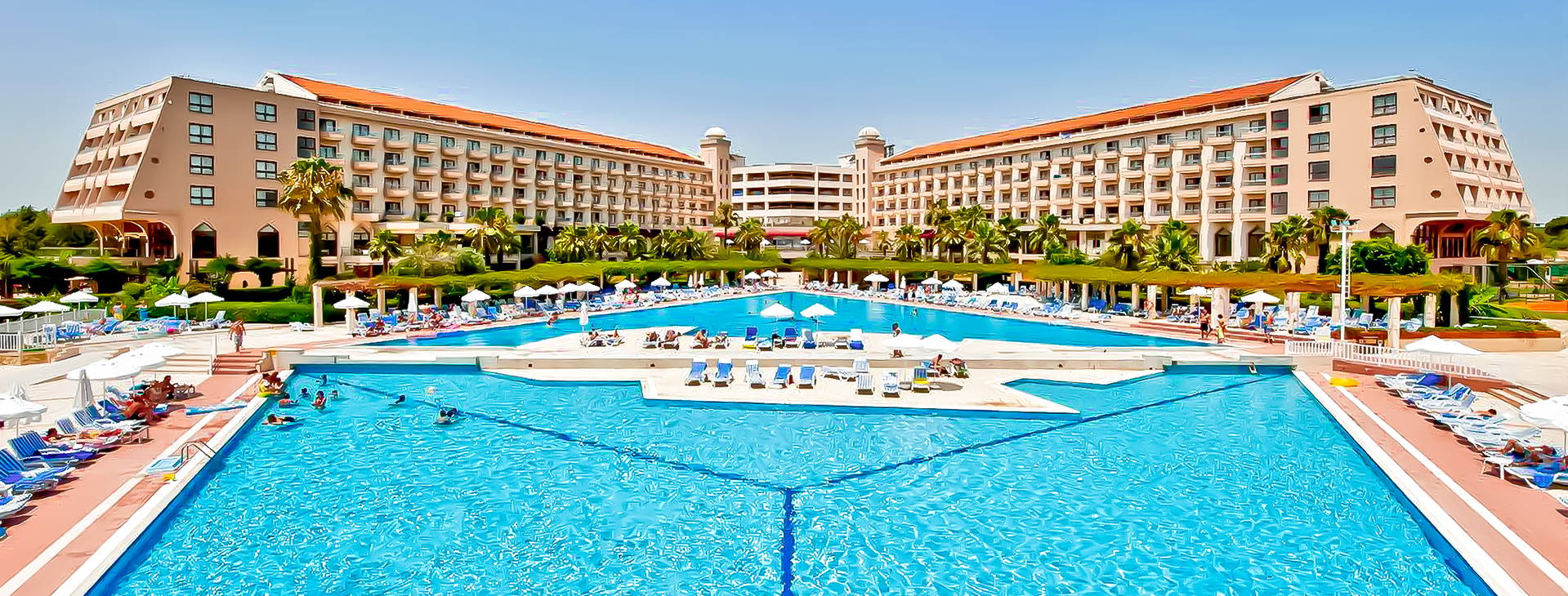 24hodinová recepce, výtahy, prostorná vstupní hala, 5 restaurací: Hlavní restaurace s bohatým bufetem a restaurace a'la carte: italská, asijská, turecká a grilovaná jídla (možnost výběru jednou za pobyt, nutná předchozí rezervace). 4 bary: v lobby 24 hodin denně, u bazénu (10:00-24:00), na pláži (11:00-17:00) a disco bar (23:30-02:00); 2 venkovní bazény, dětský bazén, bazén se skluzavkami a krytý bazén. Za poplatek: půjčovna aut, prádelna, kadeřnictví, lékař, obchody.