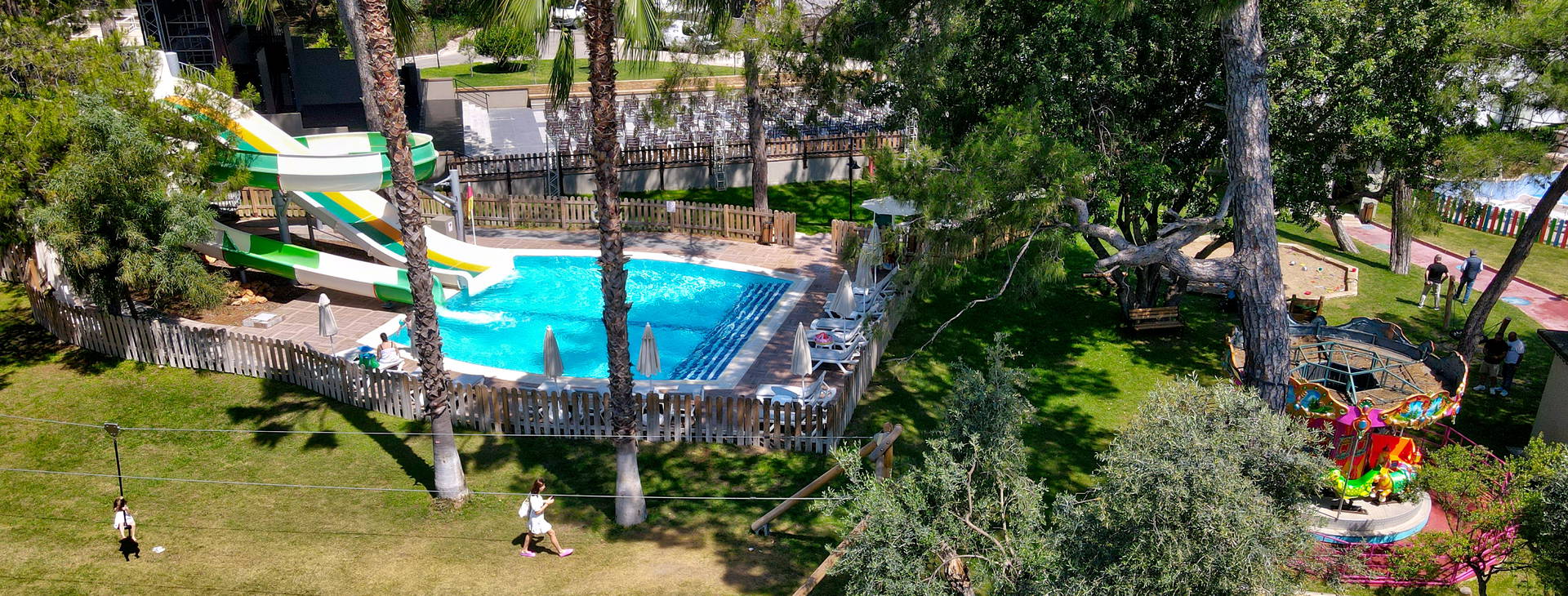 Recepce, lobby, hlavní restaurace s několika stoly na terase s výhledem na bazény a moře, restaurace a'la carte (za příplatek cca 50 EUR/osoba, nutná rezervace), food court s nabídkou občerstvení a'la carte (včetně italských jídel, burgerů, mořských plodů, polévek, kebabu), 6 barů včetně: lobby, u bazénu, Spa, cukrárna. Bazény: hlavní bazén, relaxační bazén, dětský bazén, skluzavky pro děti i dospělé. Pro děti: miniklub, dětské hřiště a animace podle hotelového programu. Za poplatek: půjčovna aut a kol, prádelna, tržnice, lékař.