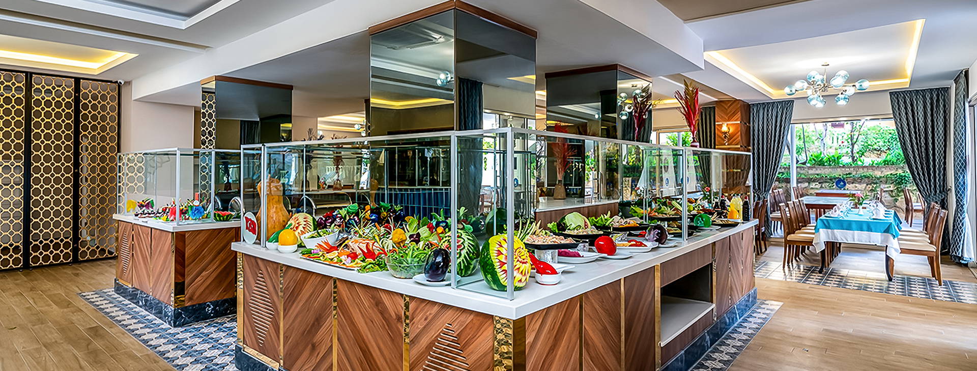 All Inclusive: snídaně (07:30-09:30), pozdní snídaně (09:30-10:00), oběd (12:30-14:00), večeře (19:00-21:00) formou bohatého bufetu. Kromě toho snack bar s občerstvením, jako je pita, pizza (11:30-16:00), káva, čaj, zákusky (16:00-17:00). Nealkoholické nápoje a místní alkoholické nápoje k dispozici v barech (10:00-24:00). Za příplatek: čerstvě vymačkané džusy, turecká káva, koktejly, dovážené alkoholické nápoje, jídlo a nápoje v plážovém baru.
