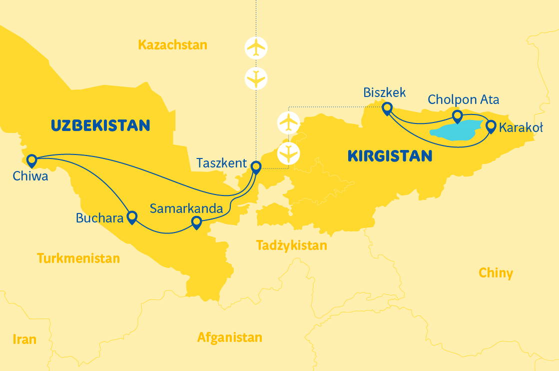 Cena zahrnuje: let na trase Varšava-Biškek/Taškent-Varšava s přestupem, vnitřní přelety Biškek-Taškent a Urgenč-Taškent (zavazadla 20 kg + 5 kg), letištní poplatky, ubytování v hotelech 3*** a 4**** (11 nocí v hotelu), stravování dle programu, transfery klimatizovaným autokarem, turistický program dle výše uvedeného, péče polského průvodce a místních průvodců, pojištění TU Europa - varianta základní (NNW, KL a zavazadla).