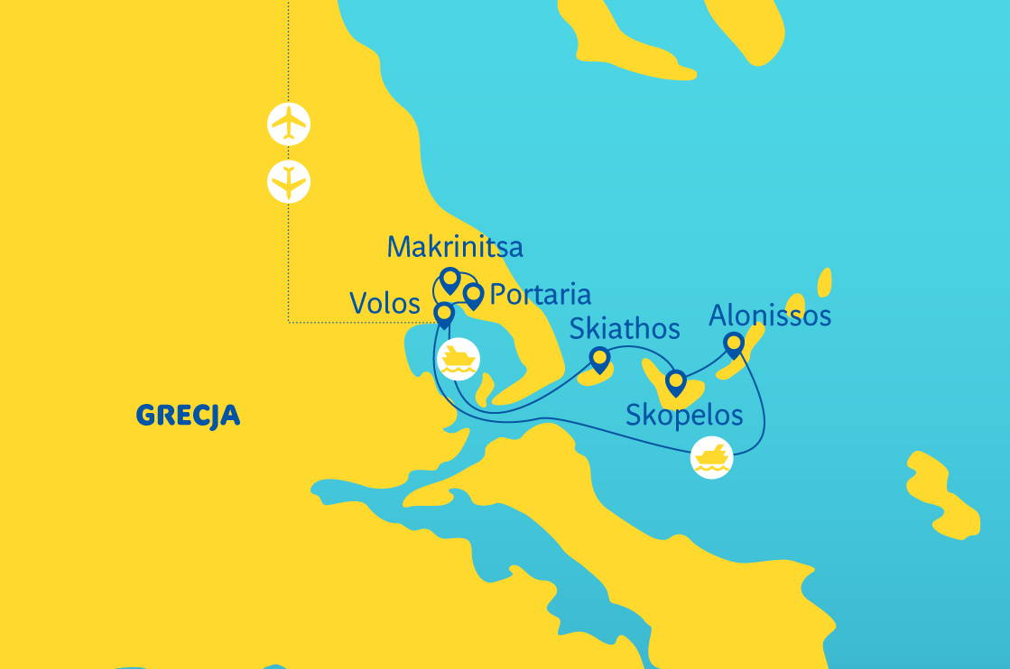 Volos • ostrov Skiathos – městečko a pláž Koukounaries • plavba lodí po Skiathosu – Lalaria Beach (volitelně) • Skopelos – filmová místa Mamma Mia • Alonissos – plavba lodí, tuleni a divoká příroda • poloostrov Pilion – horské vesnice Portaria a Makrinitsa • panorama Pagazijské zátoky • úzkokolejná železnice Pilion (volitelně) • místní taverny a řecké chutě • volný den na opalování a procházky • pro zájemce týdenní pobyt v okolí Volosu