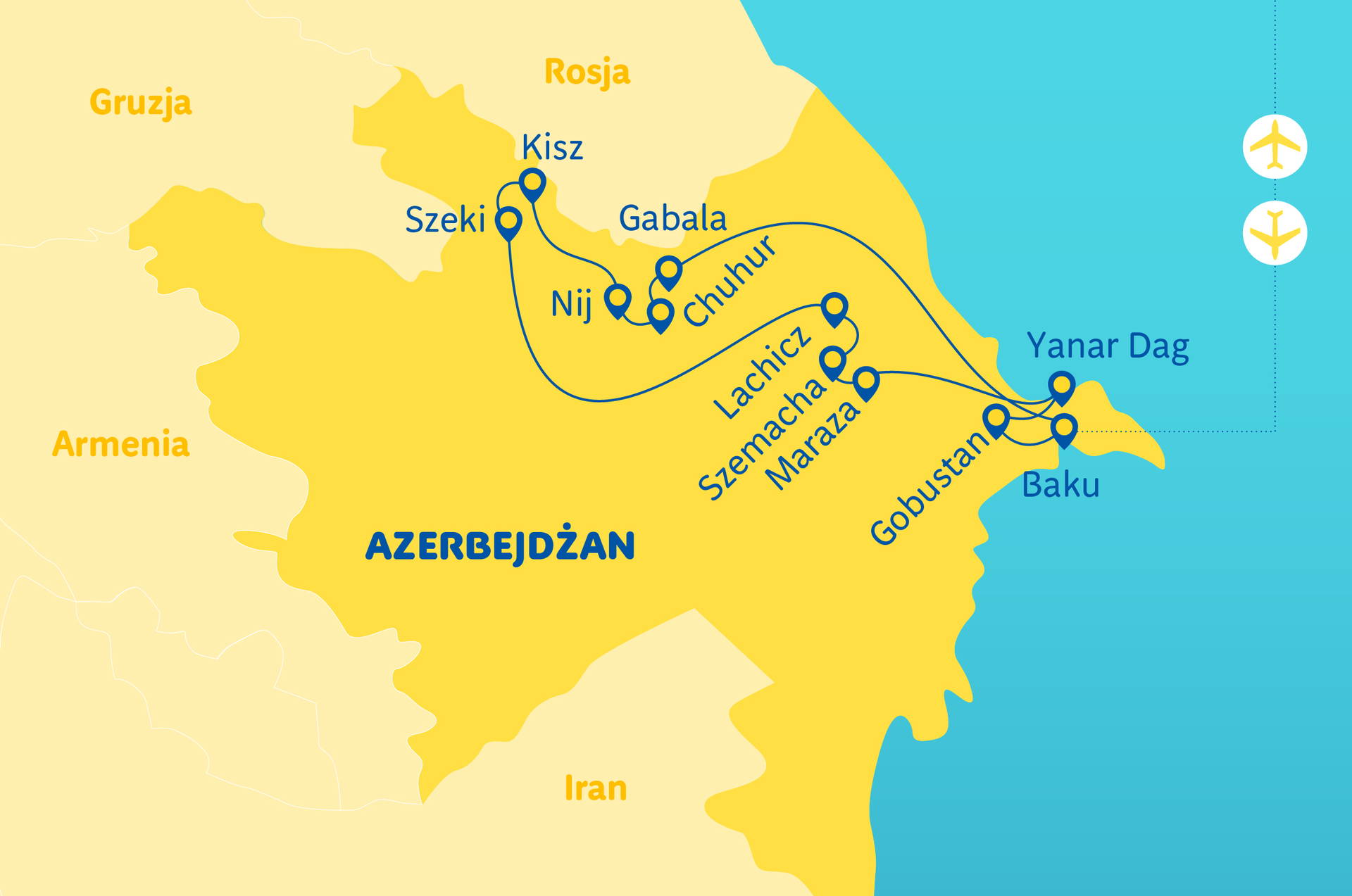 Baku - bohatství historie a petrodolarů • Khinalug - panorama Velkého Kavkazu • Lahič - řemeslo v antické vesnici • Sheki - paláce Širvanšáhů • Apšeronský poloostrov a Gobustán - chrámy ohně a bahenní sopky • neobvyklé Kulturní centrum Hejdara Alijeva • plavba po Bakuském zálivu
