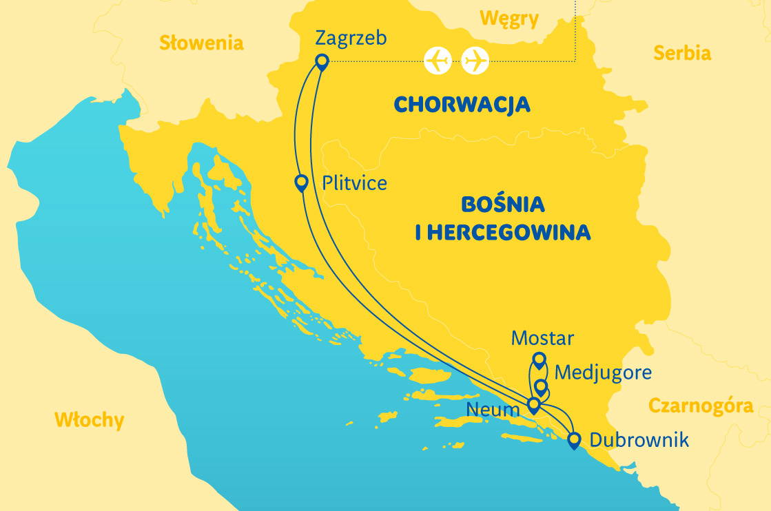 Dvě hodiny před odletem se na letišti dostavte k odbavovací přepážce. Aktuální letové řády si prosím ověřte na r.pl/rozklady. Po příletu transfer do hlavního města Chorvatska - Záhřebu, prohlídka starého města (Gornji Grad a Kaptol), katedrála Nanebevzetí Panny Marie, kostel svatého Marka, budovy Saboru, tj. chorvatského parlamentu. Během pobytu v Záhřebu je nutné navštívit největší trh, kde najdete ty nejlepší produkty z celého Chorvatska, od pikantní slavonské klobásy kulen, přes vynikající sýry z ostrova Pag až po skvělé mořské plody. Procházku s průvodcem zakončíme na slavném náměstí Bana Jelačiće, které se často stává malebnou scénou mimo jiné při oslavách úspěchů chorvatských sportovců. Po prohlídce volný čas, během kterého můžete navštívit velmi zajímavá záhřebská muzea, jako je Muzeum narušených vztahů nebo unikátní Muzeum kravaty, která vznikla v Chorvatsku. Přejezd do Neumu, jediného přímořského letoviska v Bosně a Hercegovině, večeře a nocleh v Neumu.