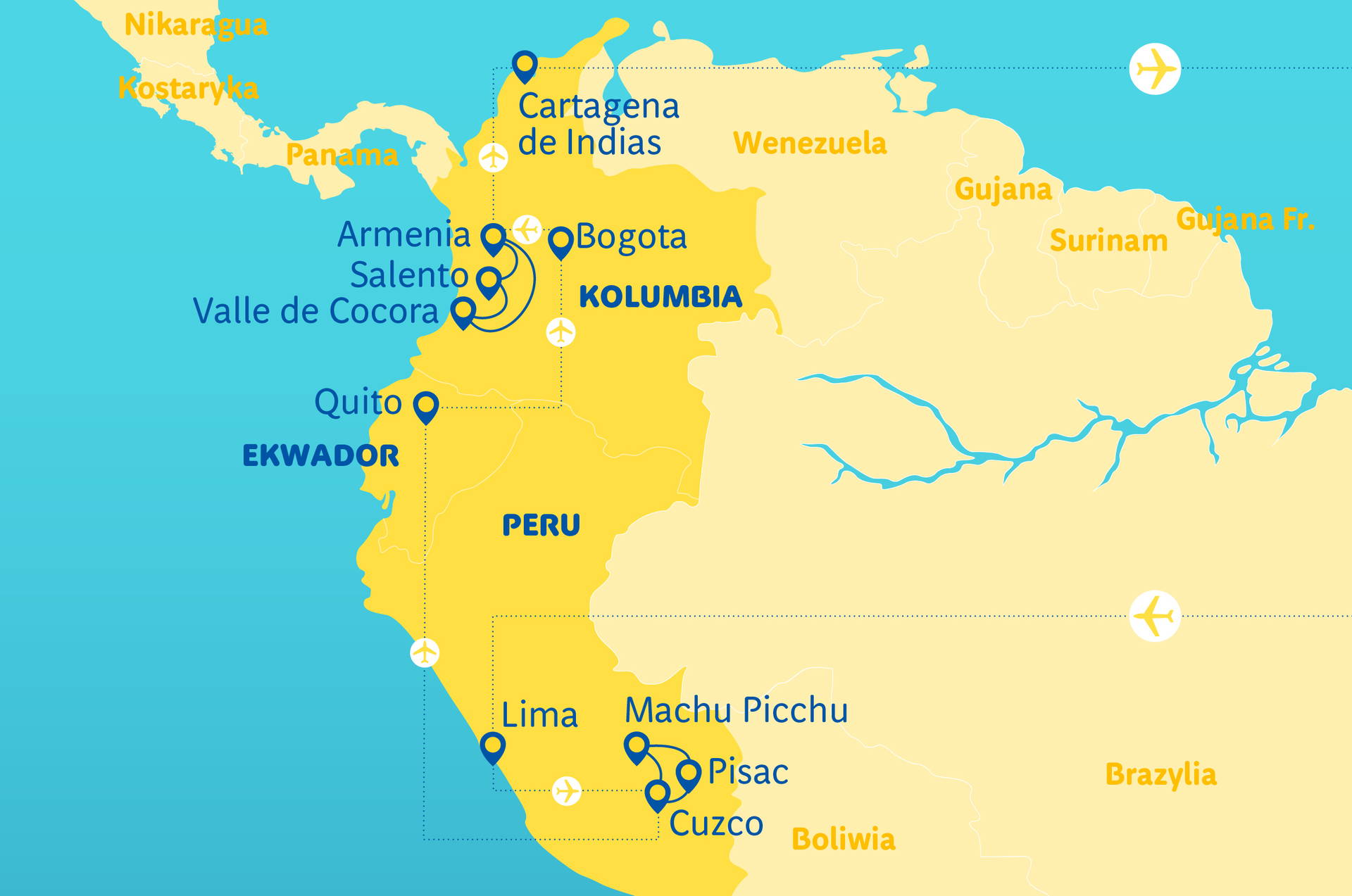 Lima - Cusco - Machu Picchu - jeden ze sedmi divů světa - Quito - druhé nejvýše položené hlavní město na světě - Bogota - metropole zlata - kouzelné údolí Cocora (UNESCO) - nejkrásnější koloniální město na světě - Cartagena de Indias.