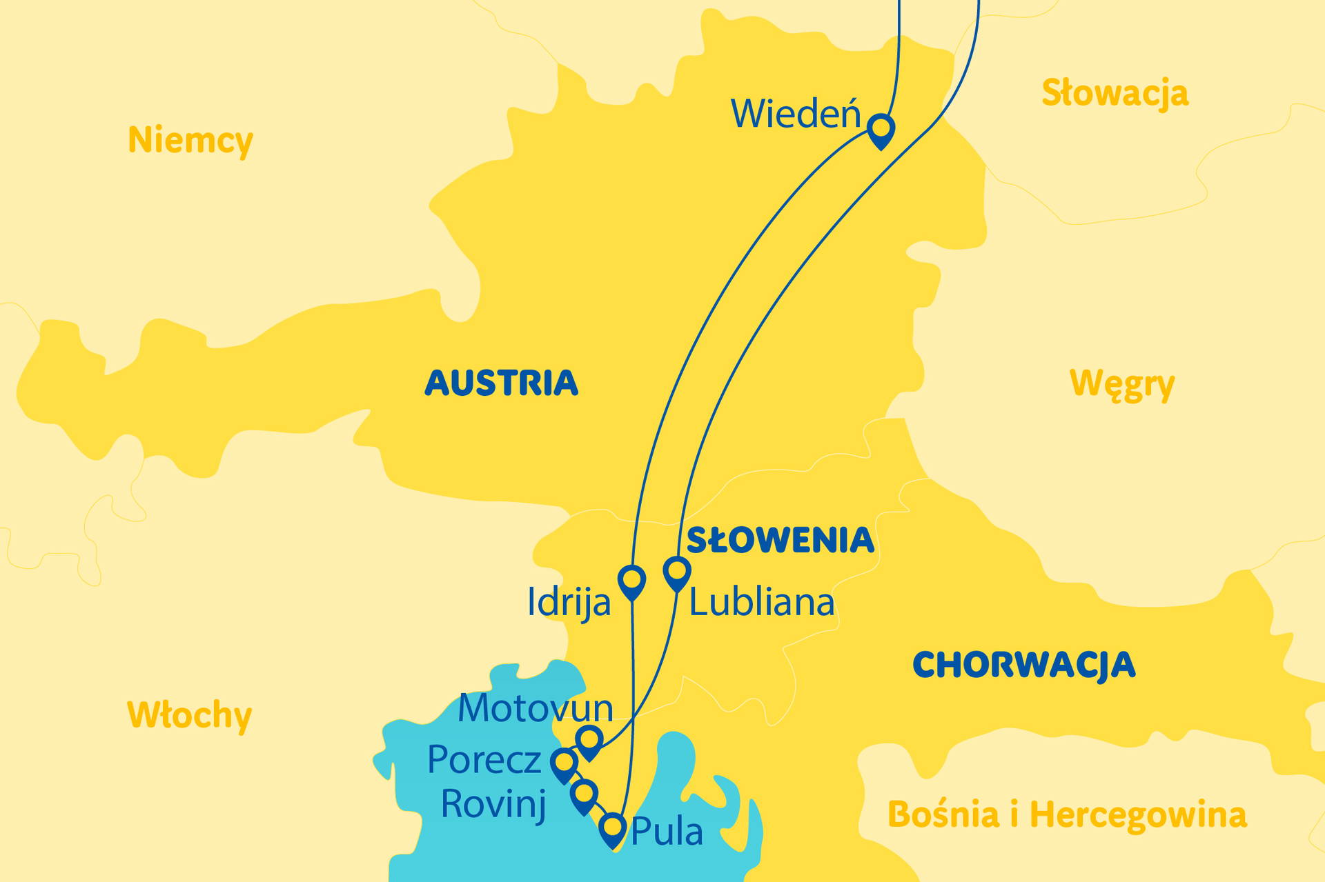 Odjezd z Polska dle řádu. Přejezd přes Česko a Rakousko. Během cesty navštívíme hlavní město Rakouska - nezapomenutelný zážitek nám poskytne noční prohlídka Vídně. V programu projížďka hlavní ulicí města - slavnou Ringstrasse. Během procházky městem uvidíme mimo jiné: Vídeňskou státní operu, radnici, zimní palác Habsburků - Hofburg, katedrálu sv. Štěpána. Následně přejezd do Slovinska. Během cesty jsou plánovány krátké zastávky.