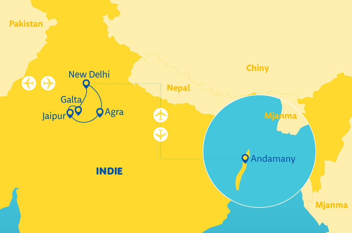 Dillí a Brána Indie - Džajpur a Amberská pevnost - opice a chrámy v Galtě - mauzoleum Tádž Mahal - Andamany